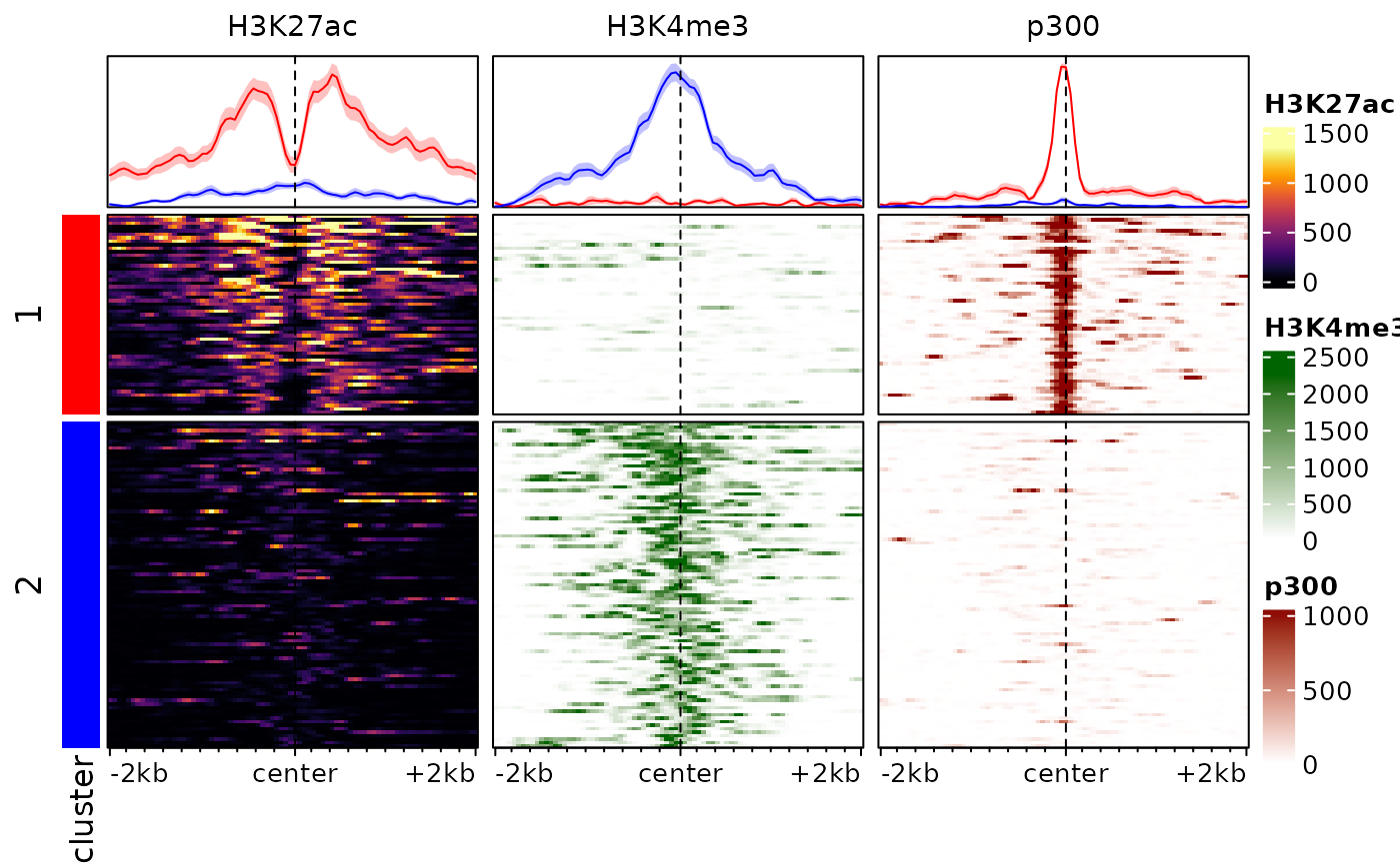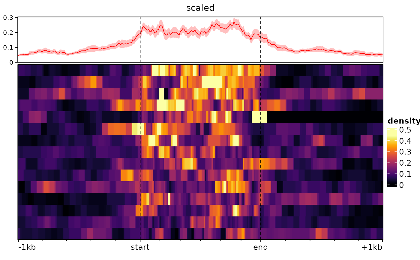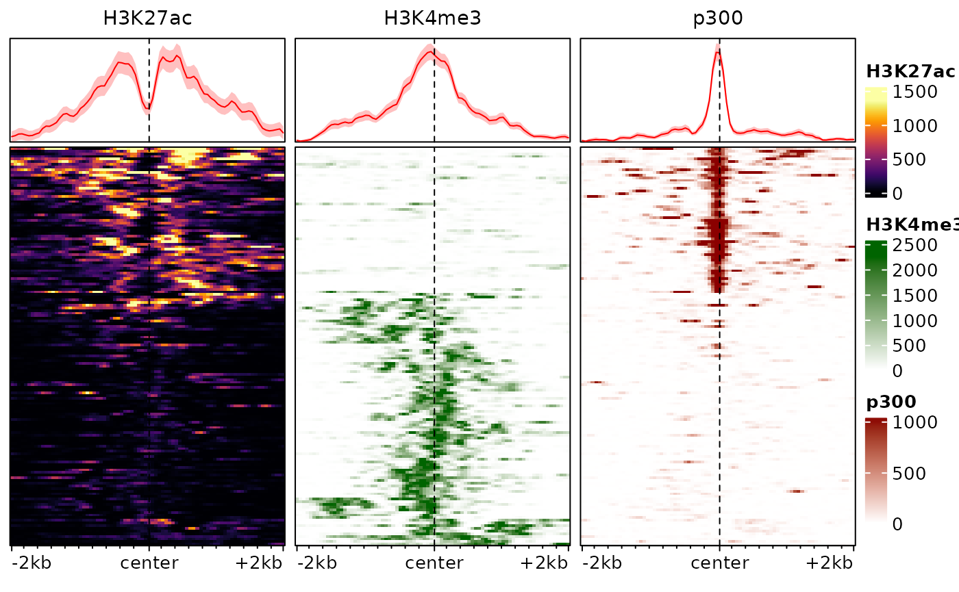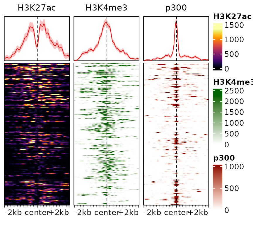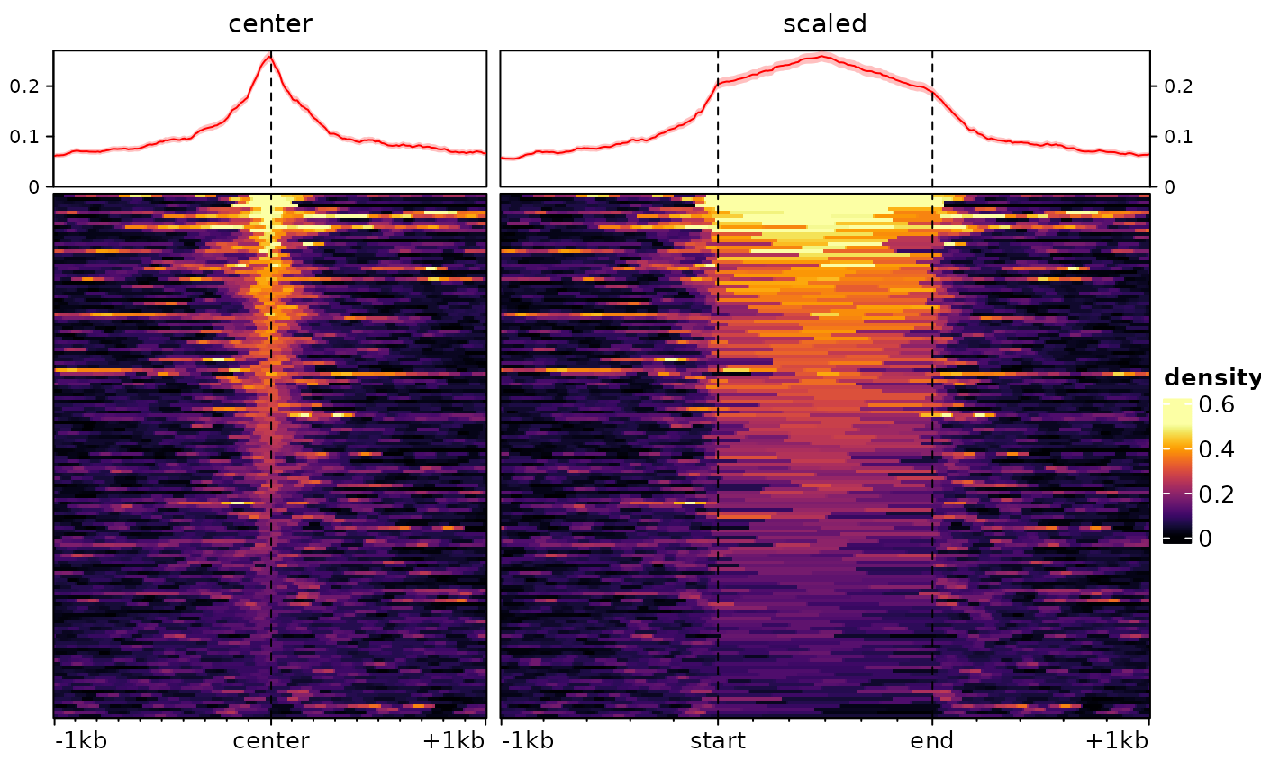 Since reading data from many regions is typically longer than plotting it, we split plotting and acquiring the data. The latter is done through function specific to this package, while the former wraps around the EnrichedHeatmap package. The interface here has been simplified, but for full functionality and customization it is recommended to have a look at the EnrichedHeatmap documentation.