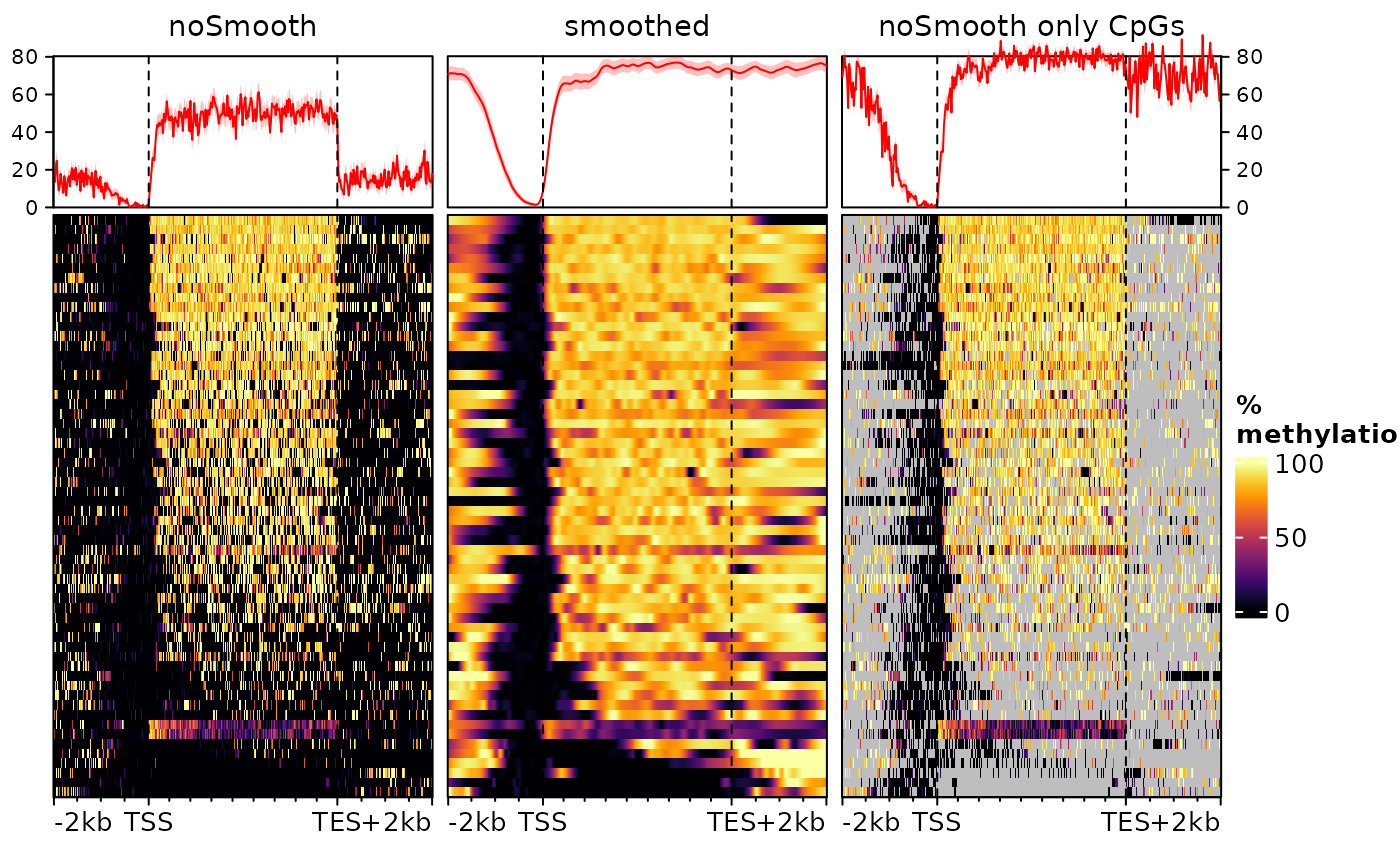 All heatmaps show a very clear absence of DNA methylation at the promoter of these genes (upstream of the TSS) and predominantly methylated gene bodies. However they disagree substantially on the methylation levels upstream the promoter and downstream the transcription end sites (TES). This is because of the density of these regions in (covered) CpG nucleotides. Since most genes are rather long, most of the bins in the gene body heatmap contain a CpG, leading to an actual methylation signal. In the flanking regions, however, this is not necessarily the case, and the left heatmap does not distinguish bins that are unmethylated form bins for which there is no information. On the right heatmap, we can see that regions downstream the TES are CpG-depleted. Instead, the smoothed heatmap (center) uses neighboring bins to estimate the methylation status of each bin, effectively filling out the gaps. In doing so it provides the truthful representation, i.e. that the regions downstream of the genes and upstream of the promoters are, most of the time, as methylated as the gene bodies.