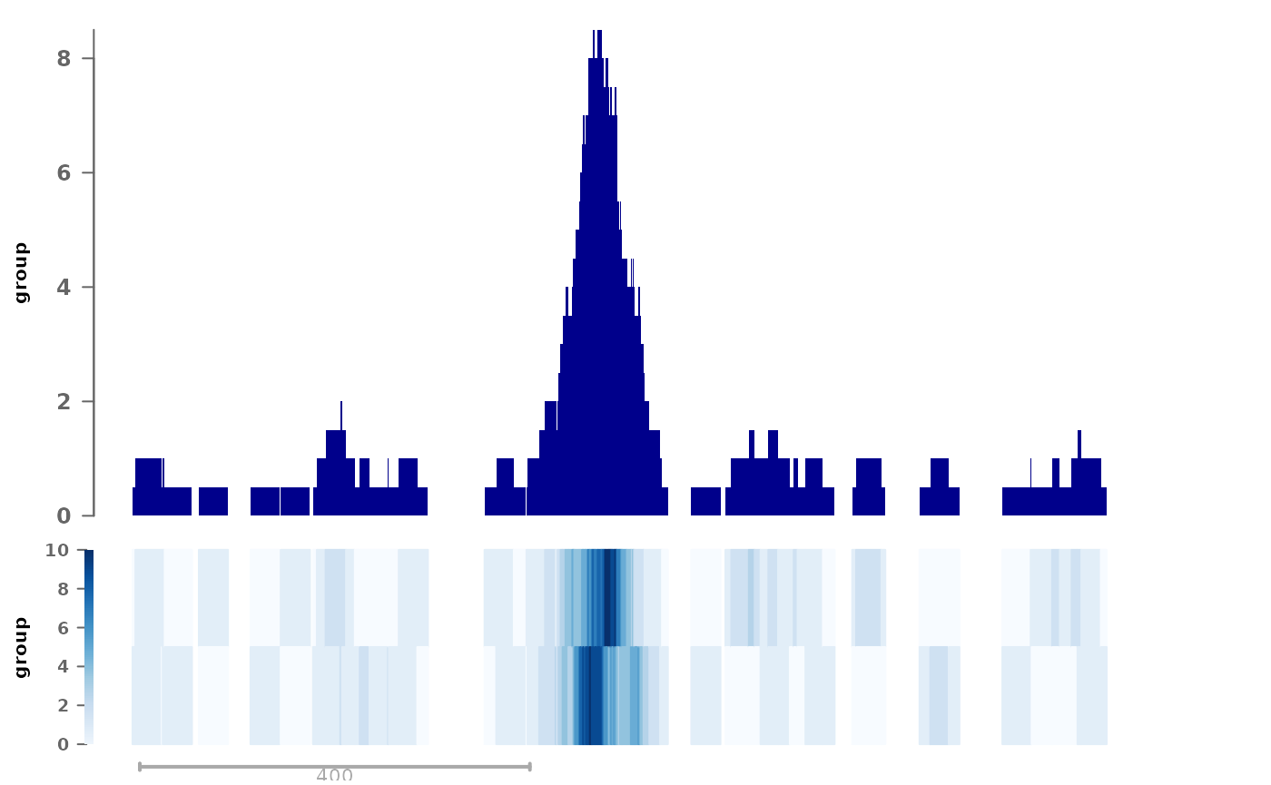 plotSignalTracks(list(group=c(bw1, bw2)), region="chr1:1-1030", aggregation="heatmap+mean")