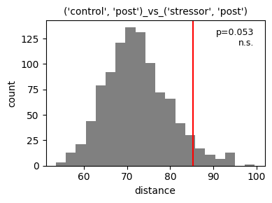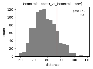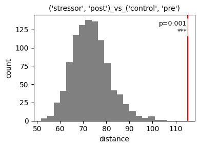 <Axes: title={'center': "('control', 'post')_vs_('stressor', 'pre')"}, xlabel='distance', ylabel='count'>),