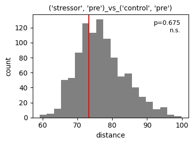 <Axes: title={'center': "('stressor', 'pre')_vs_('control', 'pre')"}, xlabel='distance', ylabel='count'>),